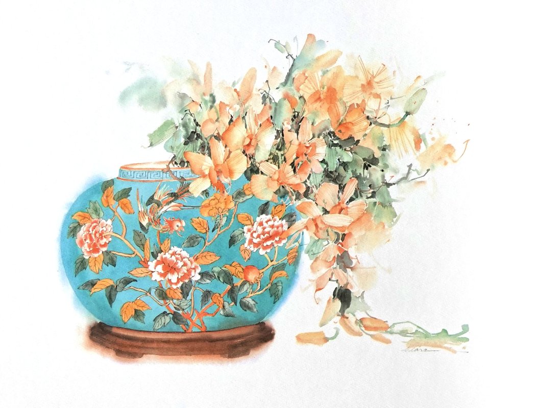 Her distinctive painting style that blends her love of nature with her more specific love of flowers. With her brushwork she can bring flowers to life on paper! She uses just a few strokes of her brushes to depict the romance, refreshing and elegance of her watercolors. Her works are most welcome by all walks of life.
